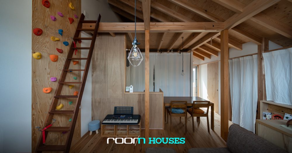 F HOUSE บ้านไม้ที่ใช้ม่านแบ่งห้อง และมีหน้าผาจำลองให้เด็กได้ปีนป่าย