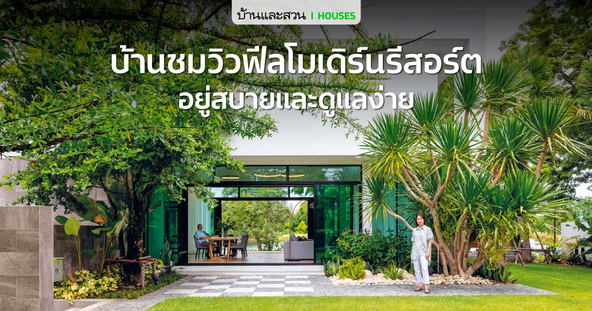 บ้านสีขาวโมเดิร์น ที่ออกแบบสำหรับหลังเกษียณ เน้นความอยู่สบาย และเป็นบ้านที่ดูแลง่าย ไม่เป็นภาระกับเจ้าของบ้านในอนาคต เมื่อมีอายุมากขึ้น ไอเดียแรกเริ่มเจ้าของบ้านอยากได้บ้านหลังเล็กๆชั้นเดียวบนที่ดินเปล่าขนาดประมาณ 1 ไร่ (ย่านศาลายา) เพื่อใช้เป็นบ้านตากอากาศวันเสาร์-อาทิตย์ในยามที่แวะเวียนมาตีกอล์ฟ และยังเหลือพื้นที่ว่างให้ลูกๆได้ปลูกบ้านกันได้ในอนาคต แต่เมื่อได้คุยกับ คุณพิมจันทร์ วิมุกตานนท์ แห่ง THK Design and Solutions Co.,Ltd. ซึ่งนำเสนอแนวทางการออกแบบมาให้หลายออฟชัน จนมาถูกใจและกลายเป็นบ้านสองชั้นพื้นที่ใช้สอย 650 ตารางเมตรหลังนี้ ที่มีพร้อมทุกอย่างสำหรับทุกคนได้มาพักผ่อนร่วมกัน บ้านสีขาวโมเดิร์น สร้างกรอบและมุมมอง บ้านตั้งอยู่ในโครงการของสนามกอล์ฟ ด้านหนึ่งติดถนนและอีกด้านติดสนามกอล์ฟซึ่งมีฉากหลังเป็นคุ้งน้ำกว้าง ล้อมด้วยทิวไม้และสนามหญ้าเขียวขจี ให้ทั้งความรู้สึกสงบ ร่มรื่น แต่ก็มีชีวิตชีวา ด้วยกีฬาตีกอล์ฟนั้นเป็นกิจกรรมโปรดของครอบครัว บรรยากาศที่สวยงามจึงเป็นจุดเด่นของพื้นที่ และนำมาเป็นแนวคิดหลักของบ้านที่อยากให้มองเห็นวิวเสมือนภาพในเฟรม และเป็นฉากให้แต่ละห้อง จึงเป็นที่มาขององค์ประกอบบ้านที่มีเส้นสายเป็นกรอบมุมทรงสี่เหลี่ยม เพื่อสร้างมุม ระยะ และองศาในการมองให้สวยงามยิ่งขึ้น โดยยกระดับพื้นบ้านให้สูงกว่าสนามกอล์ฟประมาณ 2 เมตร ทั้งเพื่อเปิดมุมมองให้กว้างและสร้างขอบเขตพื้นที่บ้านให้แยกจากสนามกอล์ฟโดยไม่ต้องทำรั้ว รวมถึงการออกแบบพื้นที่ให้ต่อเนื่องกันระหว่างภายในบ้านกับภายนอกบ้าน และระหว่างพื้นที่บ้านกับพื้นที่เปิดโล่งของสนามกอล์ฟ ยืมวิวเพื่อขยายขอบเขตสวน เมื่อมองจากถนนหน้าบ้านอาจไม่รู้เลยว่า อีกด้านของ บ้านสีขาวโมเดิร์น ทรงกล่องนี้จะทำให้รู้สึกเหมือนมาพัก รีสอร์ตสไตล์โมเดิร์น เพราะด้านริมถนนจะเห็นบ้านอยู่บนเนินที่มีแนวผนังหินช่วยพรางตาไม่ให้เห็นภายในบ้านโดยตรง […]