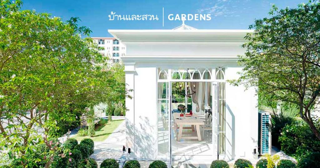 เรือนกระจกสีขาวสไตล์โมเดิร์นคลาสสิกแวดล้อมด้วยต้นไม้ตัดพุ่มเป็นระเบียบเรียบร้อยของบ้านหลังนี้ชวนให้นึกถึงบรรยากาศจิบน้ำยามบ่ายภายใน สวนยุโรป