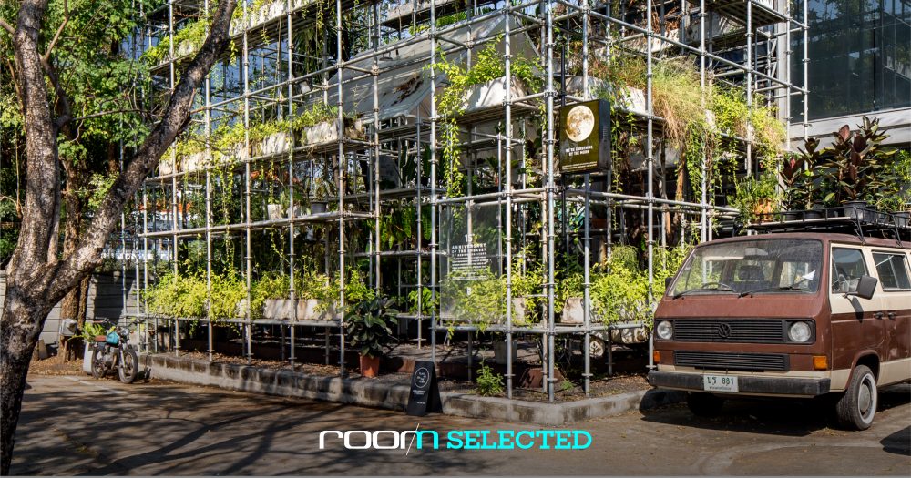 คาเฟ่ลาดพร้าว " PLANT ME ON THE MOON " ที่โดดเด่นด่วยนั่งร้านเหล็กที่อัดแน่นและล้อมรอบไปด้วยกำแพงไม้ใบ เสมือนเป็นโอเอซิสกลางกรุง