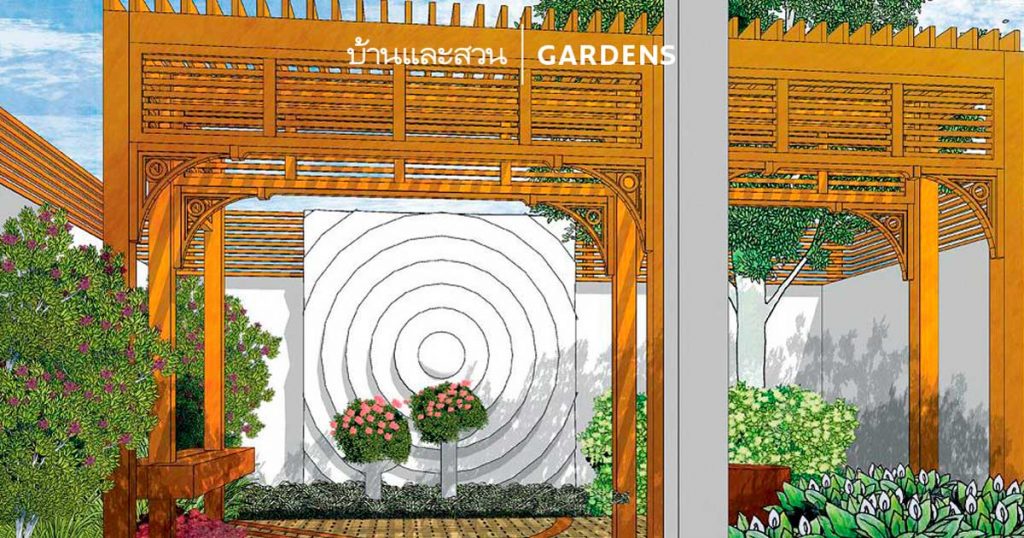 สวนสำหรับทาวน์เฮ้าส์ ควรเป็นสวนขนาดย่อม ที่ออกแบบโดยเน้นประโยชน์ใช้สอยเป็นหลัก โดยนำลวดลายวงกลมมาเพิ่มรายละเอียดในสวนให้น่าสนใจมากยิ่งขึ้น