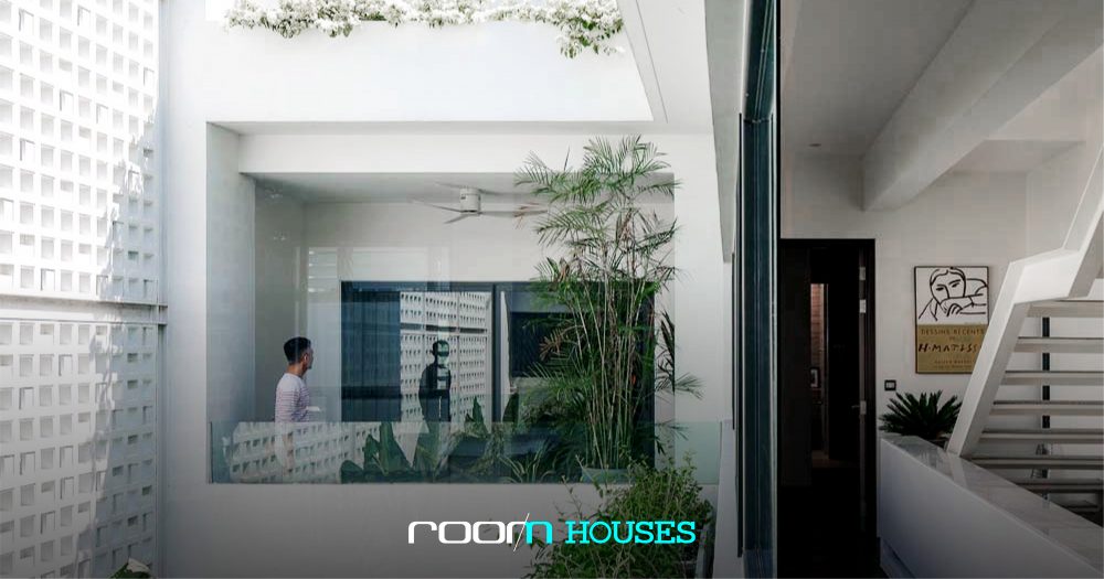 ภายใต้รูปลักษณ์ บ้านโมเดิร์นสีขาว ทรงเหลี่ยม ดูเรียบง่ายหลังนี้ ได้ซ่อนสวนสีเขียวที่ใช้พรรณไม้เขตร้อนชื้นไว้ในคอร์ต ซึ่งเป็นหัวใจของบ้านที่ออกแบบมาทั้งเพื่อเปิดรับแสงธรรมชาติให้เข้ามาสร้างชีวิตชีวาในบ้าน และทั้งเป็นการป้องกันความร้อนจากแสงแดดด้วยการปิดและพรางตามแนวคิด Modern Tropical Design เรื่องการยกใต้ถุนสูงให้ลมผ่าน และการใช้วัสดุอย่าง หน้าต่างบานเกล็ด หรืออิฐช่องลม