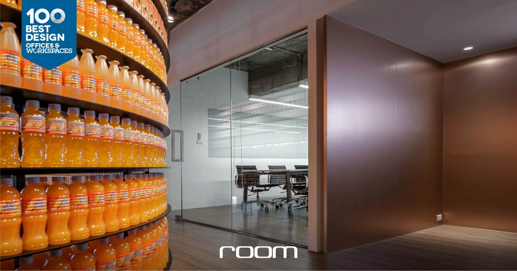 FOOD STAR พื้นที่สำนักงานของบริษัทผู้ผลิตและจำหน่ายผลิตภัณฑ์น้ำผลไม้พร้อมดื่ม ที่ใช้ขวดมาสร้างระนาบผนัง เส้นสาย และสีสันสะดุดตา